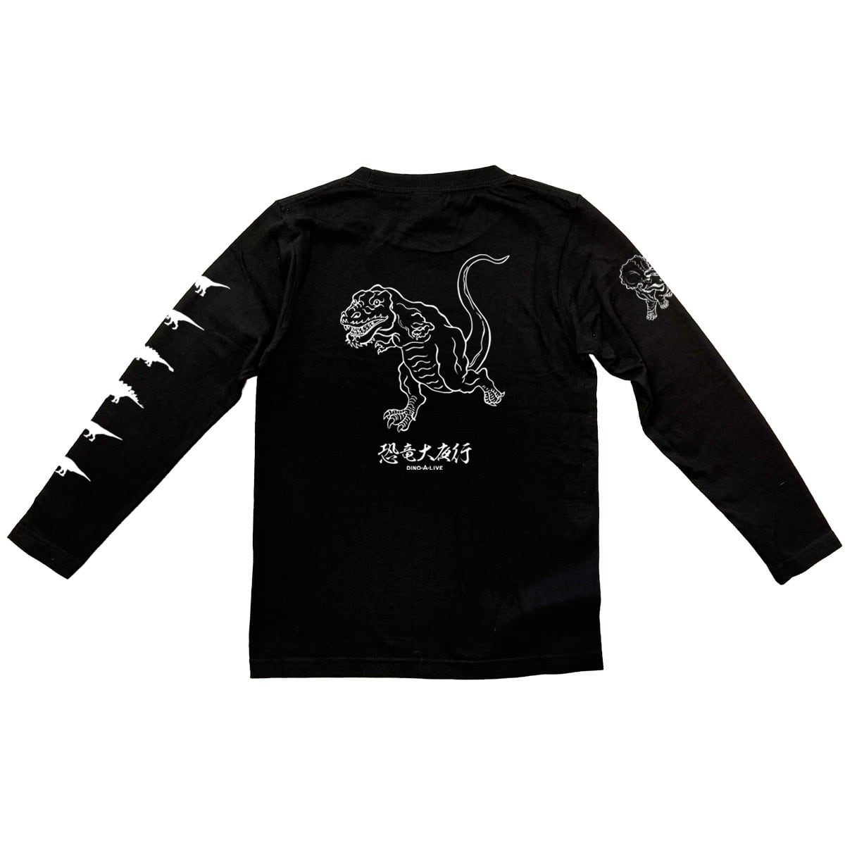 DINO-A-LIVEオリジナルロングスリーブTシャツ、前後・両腕にプリントの入った恐竜大夜行デザインが登場しました!